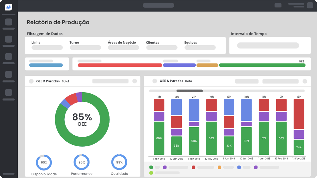 Acompanhe a eficiência dos seus equipamentos em tempo real e verifique as causas de paradas e desperdícios.